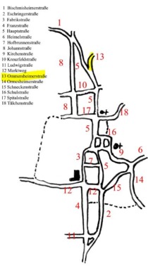 Bischmisheimerstraße | Eschringerstraße | Fabrikstraße | Franzstraße | Hauptstraße | Heimelstraße | Hofbrunnenstraße | Johannstraße | Kirchenstraße | Kreuzfeldstraße | Ludwigstraße | Marktweg | Ommersheimerstraße| Ormesheimerstraße | Schneckenstraße | Schulstraße | Spitalstraße | Tälchenstraße | Breitenbergerhof | Ensheimerhof | Gassenmühle | Thalmühle | Reichenbrunn | Sengscheid