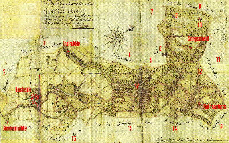 Die Wohnplätze wurden von mir rot nachkoloriert. Die Ziffern bedeuten: