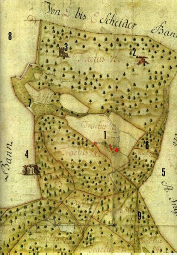 Die Häuser in Sengscheid wurden von mir rot nachkoloriert. Die Ziffern bedeuten: