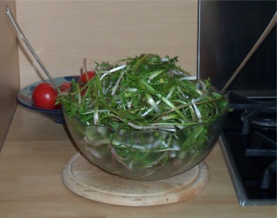 Jetzt müssen die gefääde Beddschìssa|blella, also die vorsortierten und vorgereinigten Löwenzahnblätter gründlich gewaschen werden. Gründlich heißt, in der Regel bis zu vier- oder fünfmal, je nach dem Grad der Verschmutzung.