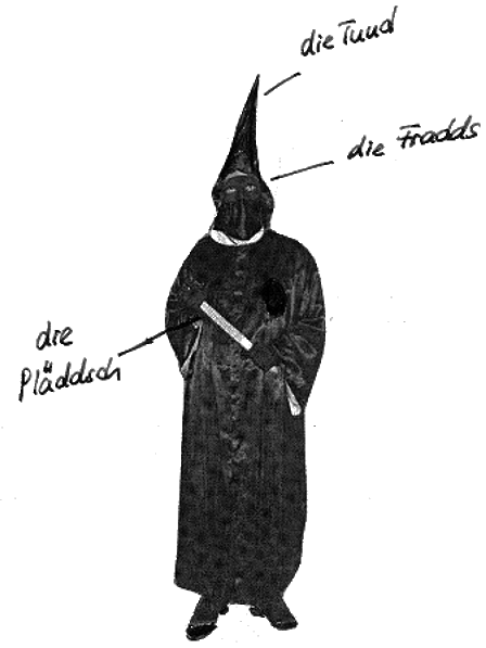 Dabei handelt es sich um die zweitliebste Faschingsverkleidung in Ensheim; aus weiblicher Sicht sogar um die liebste. Ein Dominokostüm besteht aus einer schwarzen oder andersfarbigen Kutte mit einer spitz zulaufenden Kapuze, die meistens mit einer alten Schultüte verstärkt und ausgestopft wird, damit sie richtig spitz zuläuft. Man findet jedoch mittlerweile auch Dominos, die mangels Schultüte einen dicken Knoten in die Kapuze machen. Aber das sieht nicht so gut aus. Zu diesem Kostüm trägt man e Fradds uss Schduffd (eine Maske aus Stoff mit einem Mundlappen). Der Domino hat wie die Aldi eine Pläddsch aus gefaltetem Karton als Schlaginstrument bei sich. |