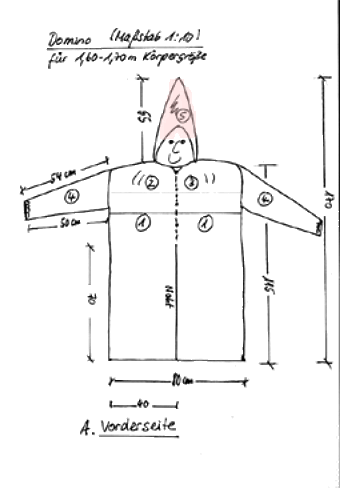 Die vier PDF-Dateien ausdrucken, passend zusammenkleben. Dann die Grafiken ausschneiden und als Muster benutzen. Das Muster paßt für die linke und die rechte Hälfte. In der Mitte vorne werden die beiden Teile zusammengenäht. Die Kapuze sollte ca. 50 - 60 cm lang sein. Sie wird mit einer Schultüte oder mit zerknülltem Zeitungspapier befüllt. Die Kapuze sauber an das Oberteil vorne und hinten annähen. Die vorderen Ansatzpunkte beachten. Das Gesichtsfeld sollte weder zu eng noch zu weit, sondern auf das Gesicht des Domino-Trägers angepaßt sein. |