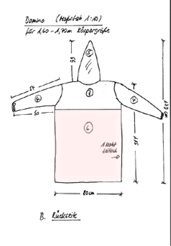 Die beiden PDF-Dateien ausdrucken, die beiden DIN A 4-Seiten zusammenkleben und die Grafik ausschneiden. Oben wird das untere Rückenteil mit dem Oberteil vernäht. werden die beiden Teile im unteren Bereich zusammengenäht. Nach unten muß die passende Länge nach dem Domino-Träger abgemessen werden. Der Domino sollte bis ca. 15 cm über den Boden reichen. Nicht tiefer, weil man dann gerne auf den Saum tritt, vor allem beim Treppensteigen. Das Rückenteil wird mit einer seitlichen Längsnaht an das Vorderteil angenäht. |