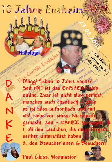 Wie gerne hätte ich dieses Ereignis vor Ort in Ensheim gefeiert, und zwar zünftig mit einem Fest, wie es bisher noch keines gab: mit einem Beddschìssa-Feschd. Doch erstens hatte ich keine Zeit - die Arbeit am neuen Buch über Pfarrer Franz geht in die Endphase -, zweitens gab's noch keinen Beddschìssa, drittens braucht man zur Organisation genungk Lied - und viertens bin ich einfach zu weit weg, um so äbbes se organisìere. Deshalb feiern wir virtuell und sehen uns im Ensheimer Cyberspace an aufgehübschten Biergarnituren sitzen, auf denen baadbiddwies de Beddschìssa steht, natürlich angemacht nach den beiden klassischen Rezepten - kalt und warm -, dazu gibt's frische Bròòdgrùmbìere und ein frisch gezapftes Pils à la Bärwel olla Ortrud. Und hinterher gibt's - ei jòò - e Ensemma Sälwagebrännda vùmm Fäinschde, e 97er Reinklodde medd 47 Vol%. Dòò flìehd och's Hìddche furrd ... awwa wie widd! Und musikalisch umrahmt wird das Ganze von Birger Bowles vùnn da Gassemiehl mit seinem genialen Beddschìssa-Rogg ... Viel Spaß dabei! |