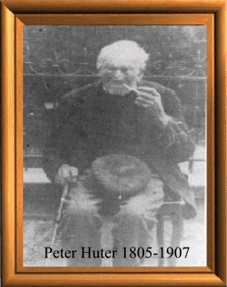 Er wurde am 27. Juli 1805 in Ensheim als Sohn von Mathias Huter und Gertrud Wetzel geboren und war ein Ur-Urenkel des Begründers der großen Huter-Sippe, Christoph Huter. Er heiratete am 16. Februar 1833 in Ensheim Barbara Schmitt, die Tochter des Dosenmachers Johann Georg Schmitt und Anna Catharina Weishaar. Er wurde 102 Jahre alt und starb am 13. August 1907. Peter Huter wurde als der "Hundertjährige Huter" einem größeren Publikum in Bayern bekannt, weil er zweimal an der sog. "Fußwaschung" am Münchner Königshof teilnehmen konnte. |