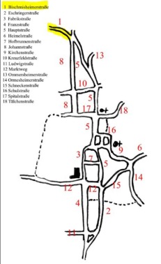 Bischmisheimerstraße | Eschringerstraße | Fabrikstraße | Franzstraße | Hauptstraße | Heimelstraße | Hofbrunnenstraße | Johannstraße | Kirchenstraße | Kreuzfeldstraße | Ludwigstraße | Marktweg | Ommersheimerstraße | Ormesheimerstraße | Schneckenstraße | Schulstraße | Spitalstraße | Tälchenstraße | Breitenbergerhof | Ensheimerhof | Gassenmühle | Thalmühle | Reichenbrunn | Sengscheid