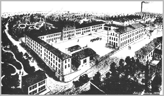 Das Fabrikgebäude der Gebrüder Adt im Jahre 1889, hervorgegangen aus der ehemaligen Propstei des Prämonstratenserklosters Wadgassen, zu dem Ensheim jahrhundertelang gehörte. Heute Sitz der Firma Hager electroplastic. Im Hintergrund ist der Hofgarten zu sehen, der in Ensheim Hobbgarde genannt wird. Darüber der noch unbebaute Wickersberg.