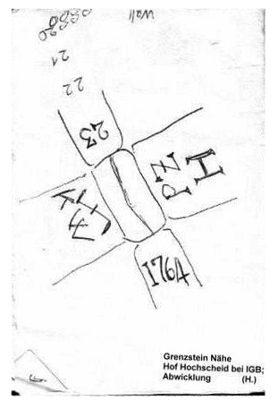 Der Wanderhans aus St. Ingbert hat mich auf diesen alten GRENZSTEIN im Raum Hochscheid südlich von St. Ingbert hingewiesen und mir auch gleich die nachfolgende Skizze geschickt. Vielen Dank, Hans!!!