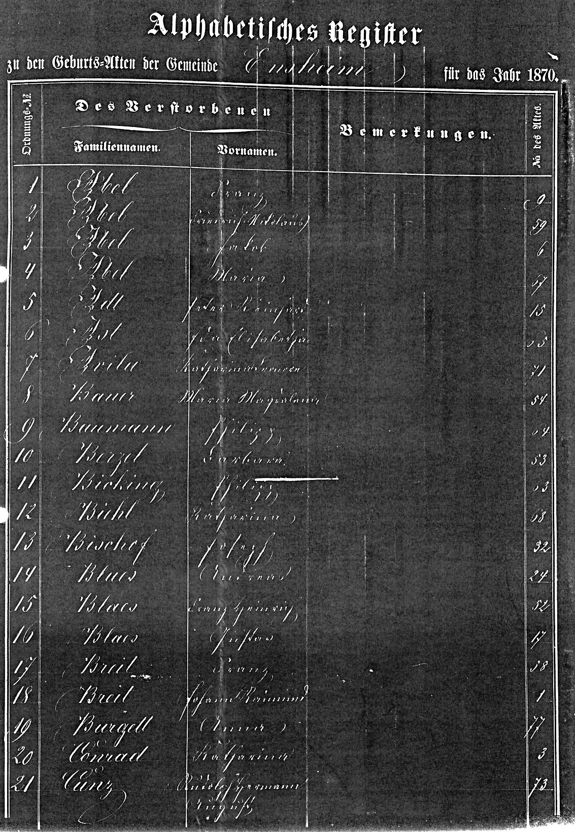 Geburtsregister, 1870, alphabetisches Register